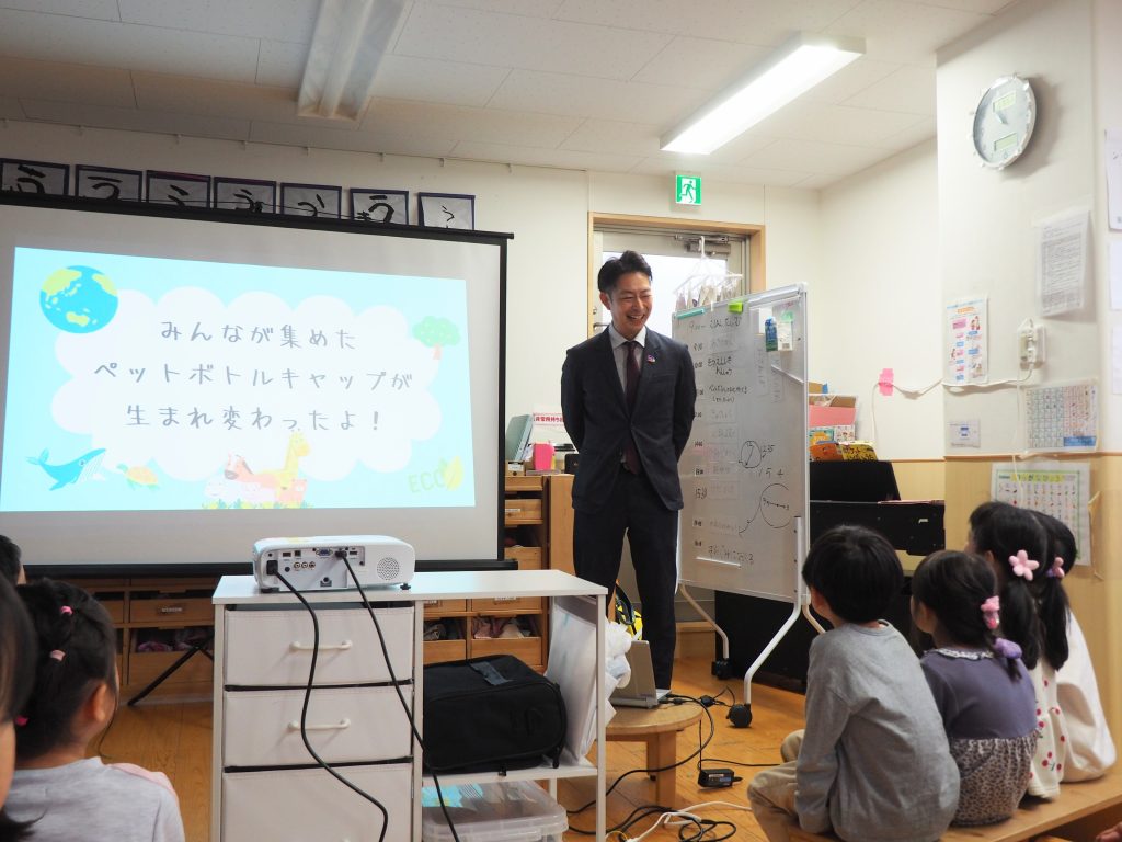 環境学習では、日本山村硝子のご担当者様より、園児たちが集めたペットボトルキャップがどのように回収・分別され、リサイクルされてプランターへと生まれ変わるのかを、スライドショーを交えながら分かりやすく説明いただきました。